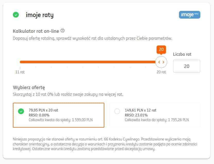 W ramach płatności iMoje dostępne są płatności ratalne w dwóch wariantach – standardowe raty z korzystnym oprocentowaniem lub Raty 0%, dzięki którym nie ponosisz żadnych kosztów rozłożenia płatności na raty (RRSO 0%) oraz standardowe raty z oprocentowaniem, które pozwalają rozłożyć płatność na jeszcze dłuższy okres.