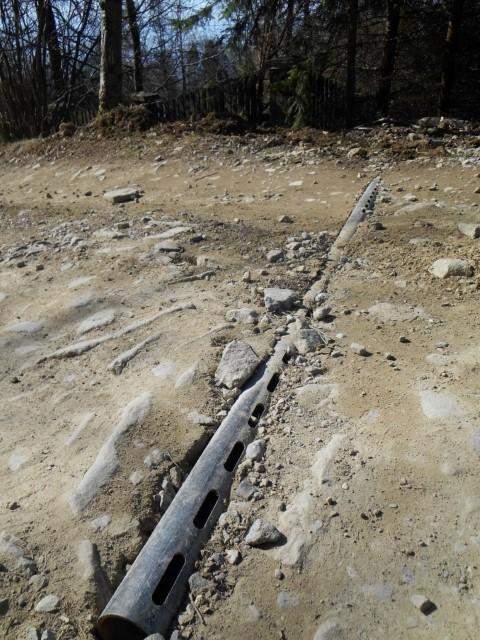 W najwyższym puncie naszego gospodarstwa zainstalowałem w poprzek drogi przepust zrobiony z rury o średnicy 6 cm kupionej na złomie. Zaprzyjaźniona firma wyfrezowała odpowiednie otwory. Póki co patent się dobrze sprawdza – rura się nie zapycha i łapie całą spływającą wodę oraz – co ważne, nie przeszkadza samochodom. Bezpośrednio nad ujęciem jest ok. 100 m drogi o szerokości prawie 4 m. 400 m2 utwardzonej powierzchni – całkiem sporo. Biorąc pod uwagę, że nad drogą jest około hektarowy stok, z którego nadmiar wody spływa na drogę, mamy całkiem spore zlewisko.