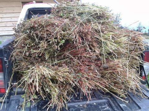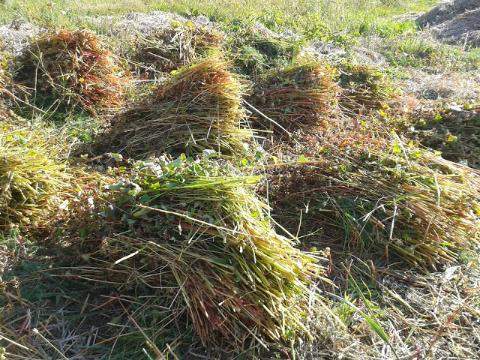 W tym roku kosiłem grykę sierpem w obawie przed wytrząśnięciem zbyt dużej ilości cennych nasion. Zajęło mi to około dwóch godzin. W przyszłym roku zamienię sierp na kosę. Myślę, że w ten sposób koszenie poletka zajmie nie więcej niż pół godziny. Nasiona trzymają się mocno i kosa nie powinna zrobić nadmiernych szkód.