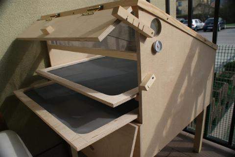 Sama praca nad suszarnią w czasie długich zimowych wieczorów była już dużym relaksem 😀. Suszarnia to pudło zrobione z wodoodpornej sklejki. Na górze jest umieszczona pod kątem szyba. W środku pudła znajdują się dwie półki na suszonki, a pod pułkami jest blacha pomalowana na czarno. Półki leżą na listewkach i można je swobodnie wyciągnąć przez drzwiczki.